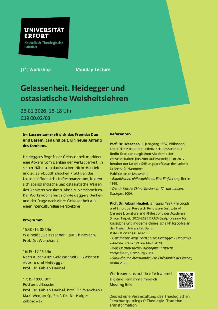Im Rahmen der Monday Lecture des theologischen Forschungskollegs t3 (Theologie – Tradition – Transformation) der Universität Erfurt findet am 26.01.2026, von 15-18 Uhr, in Raum C19.00.02/03 ein Workshop zum Thema „Gelassenheit. Heidegger und ostasiatische Weisheitslehren“ statt, der über Heideggers Abwendung von einem Verfügbarkeitsdenken in seinem Begriff der Gelassenheit die Möglichkeit eines interkulturellen Dialogs zwischen ostasiatischen Weisheitslehren und Heideggers Denken aufzeigt. Die Veranstaltung wird von Prof. Dr. Dr. Holger Zaborowski und Maxi Wenjun Qi organisiert. Es referieren Prof. Dr. Wenchao Li und Prof. Dr. Fabian Heubel.